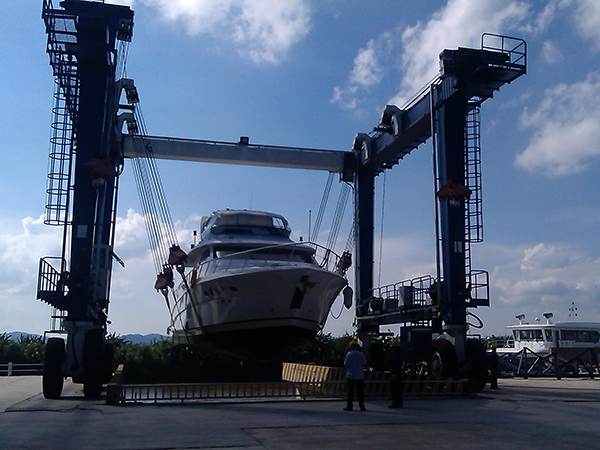 湖北十堰游艇輪胎吊公司游艇輪胎吊用于船廠、游艇俱樂部、水上娛樂中心、海軍等,主要用于船艇的維修和保養出入水工作,該設備額定起重量為32~800t,全液壓驅動,采用柔性吊裝帶兜住船體底部,多吊點同時起吊,運行和轉向方式變化多樣,一般有直行,斜行,阿克曼轉向,原地回轉,八字轉向等,根據客戶的不同需求進行不同的配比。主要有以下特點: